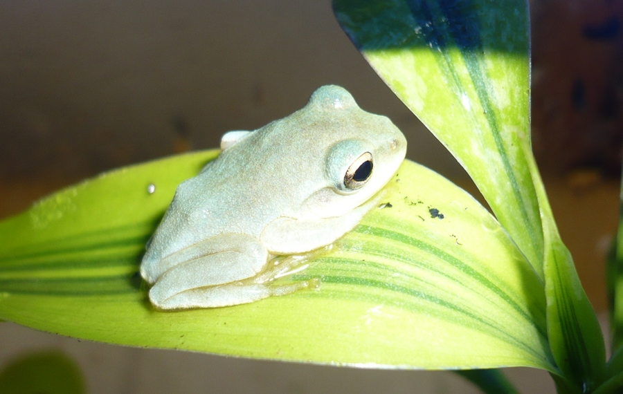 高いところが好き(どちらかというと樹上製のカエルなので)葉っぱの上、葉っぱの隙間にいることが多いです。