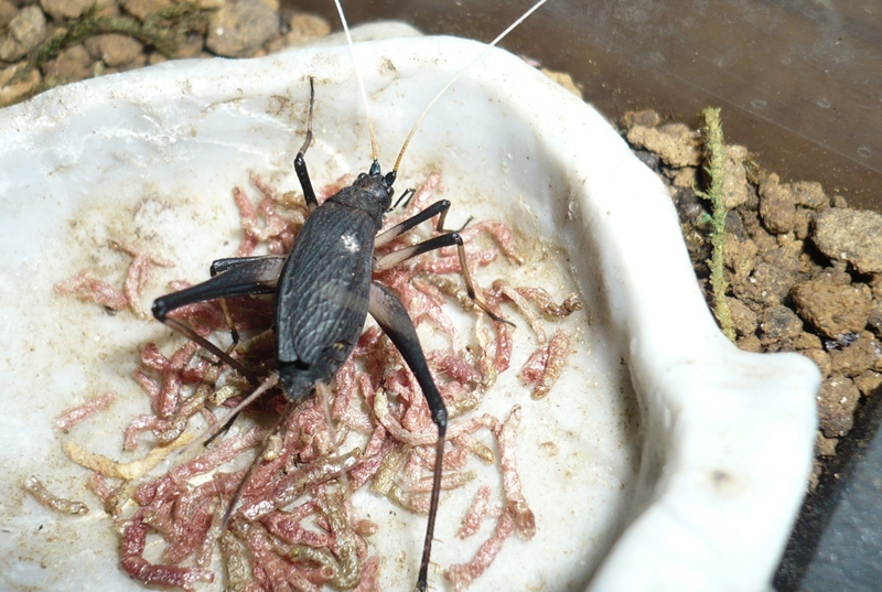 餌場を後にゆっくり食事するメスのスズムシ。