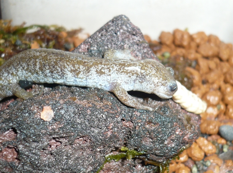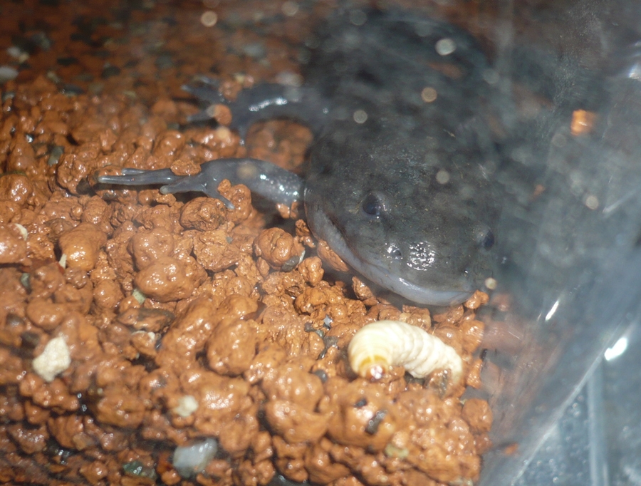 ぶどう虫を見せると必死で興味を示すカスミサンショウウオ。