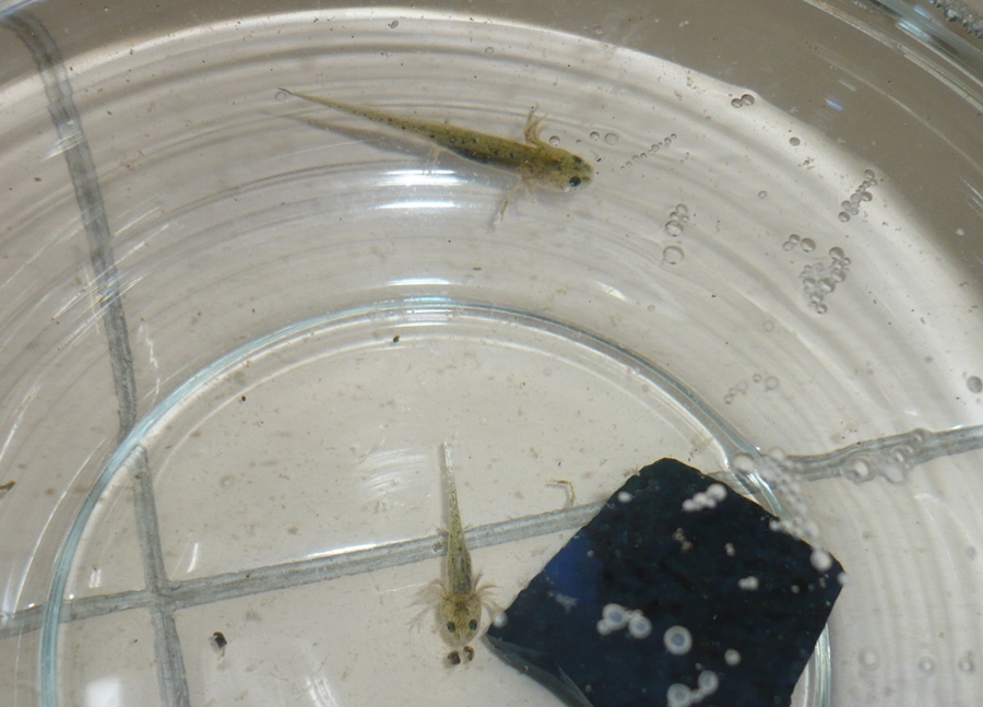右の横倒しになっている弱々しい孵化直後の幼生。