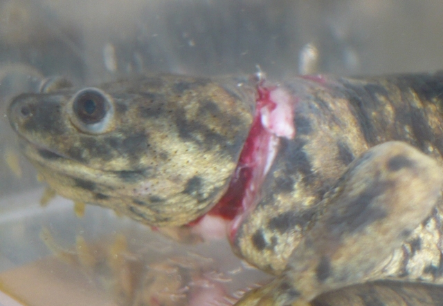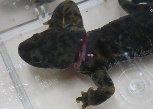 見るも無残なイベリア。片方前脚から反対の脇にテグスが食い込んでいた。
