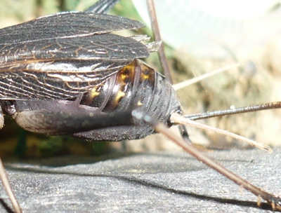 お尻の真ん中から出ている産卵管、これを土中に差し込んで産むのです。